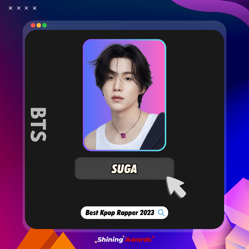 Congratulations to Suga of BTS as The Winner of Best Kpop Rapper 2023.